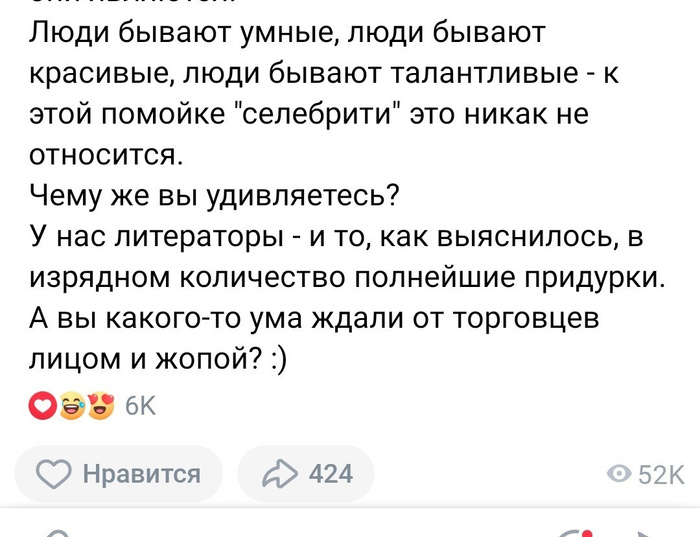 Игнорирование -лучшее решение в отношении фриков, все разорались-пипидастры довольны, подпитались вашей энергией, стали ещё популярнее, богаче, влиятельнее и их опять пригласили на каналы народ развлекать :hihiks: